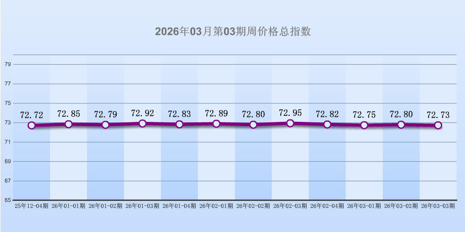 据“中国·海宁皮革指数”信息系统监测,2026年03月第03期周价格总指数报收于72.73点,环比下跌0.07点,环比跌幅0.10%,6大分类涨跌平比例是2:3:1。本周皮革城传统市场销势呈现微幅下跌,其中箱包皮具类、原材料类价量不等量上涨,服装类、服饰类、鞋类价量不等量下跌,其他类价量保持不变。