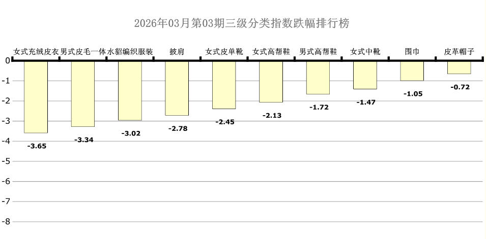 6大分类三级分类中女式充绒皮衣、男式皮毛一体、水貂编织服装、披肩、女式皮单靴、女式高帮鞋、男式高帮鞋、女式中靴、围巾、皮革帽子处于跌幅榜前十列,环比跌幅分别为:3.65点、3.34点、3.02点、2.78点、2.45点、2.13点、1.72点、1.47点、1.05点、0.72点。本期男式皮毛一体、女式皮单靴、女式高帮鞋、男式高帮鞋、女式中靴均呈现涨后回落态势。(文章来源:海宁市皮革行业协会)