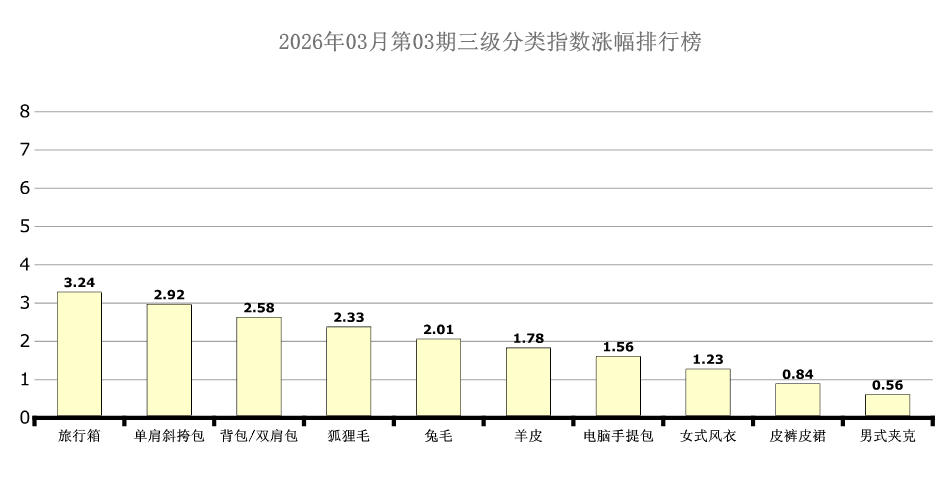 6大分类三级分类中旅行箱、单肩斜挎包、背包/双肩包、狐狸毛、兔毛、羊皮、电脑手提包、女式风衣、皮裤皮裙、男式夹克处于涨幅榜前十列,环比涨幅分别为:3.24点、2.92点、2.58点、2.33点、2.01点、1.78点、1.56点、1.23点、0.84点、0.56点。本期旅行箱、单肩斜挎包、背包/双肩包、狐狸毛、兔毛、羊皮、电脑手提包均呈现止跌反弹态势。