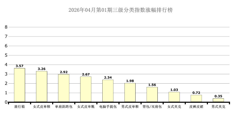 6大分类三级分类中旅行箱、女式皮单鞋、单肩斜挎包、女式皮单靴、电脑手提包、男式皮单鞋、背包/双肩包、女式夹克、皮裤皮裙、男式夹克处于涨幅榜前十列,环比涨幅分别为:3.57点、3.26点、2.92点、2.67点、2.34点、1.98点、1.56点、1.03点、0.72点、0.35点。本期旅行箱、女式皮单鞋、单肩斜挎包、女式皮单靴、电脑手提包、男式皮单鞋、背包/双肩包均呈现止跌反弹态势。