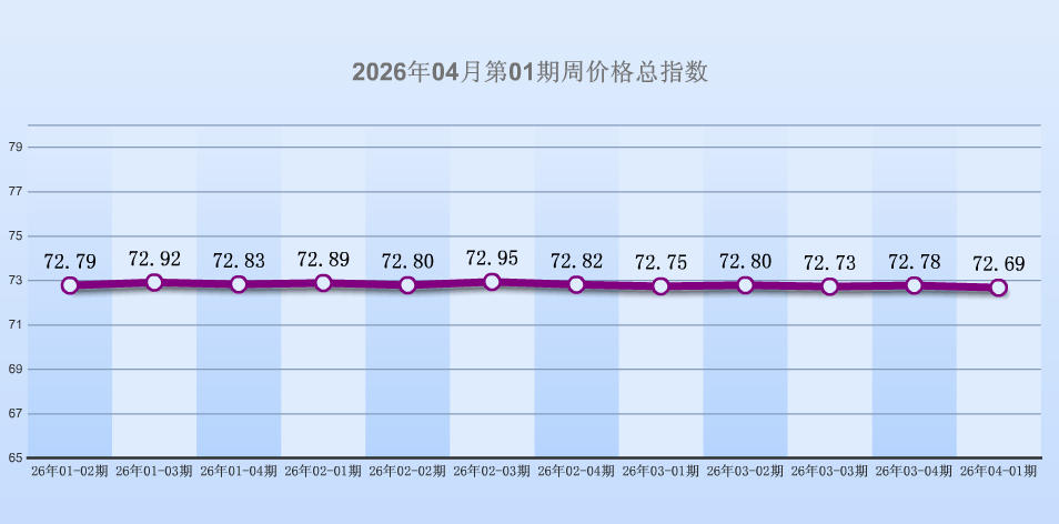 据“中国·海宁皮革指数”信息系统监测,2026年04月第01期周价格总指数报收于72.69点,环比下跌0.09点,环比跌幅0.12%,6大分类涨跌平比例是2:2:2。本周皮革城传统市场销势呈现微幅下跌,其中箱包皮具类、鞋类价量不等量上涨,服装类、服饰类价量不等量下跌,其他类、原材料类价量保持不变。