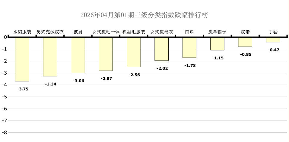 6大分类三级分类中水貂服装、男式充绒皮衣、披肩、女式皮毛一体、狐狸毛服装、女式皮棉衣、围巾、皮草帽子、皮带、手套处于跌幅榜前十列,环比跌幅分别为:3.75点、3.34点、3.06点、2.87点、2.56点、2.02点、1.78点、1.15点、0.85点、0.47点。本期水貂服装、披肩、狐狸毛服装、围巾、皮草帽子、皮带、手套均呈现涨后回落态势。(文章来源:海宁市皮革行业协会)